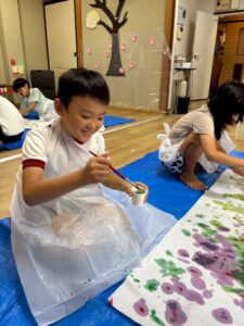 教室内では季節に合わせて壁面を秋色にしようと子供達で大きな模造紙を色付けしました。
