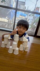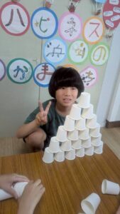 ルール遊びでは紙コップを使ってピラミッドを作りました。