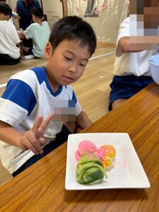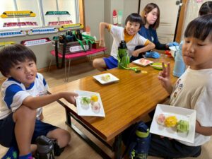 おやつ作りでは、てまり寿司といも餅を作りました。きゅうり、錦糸卵、ハムを酢飯と