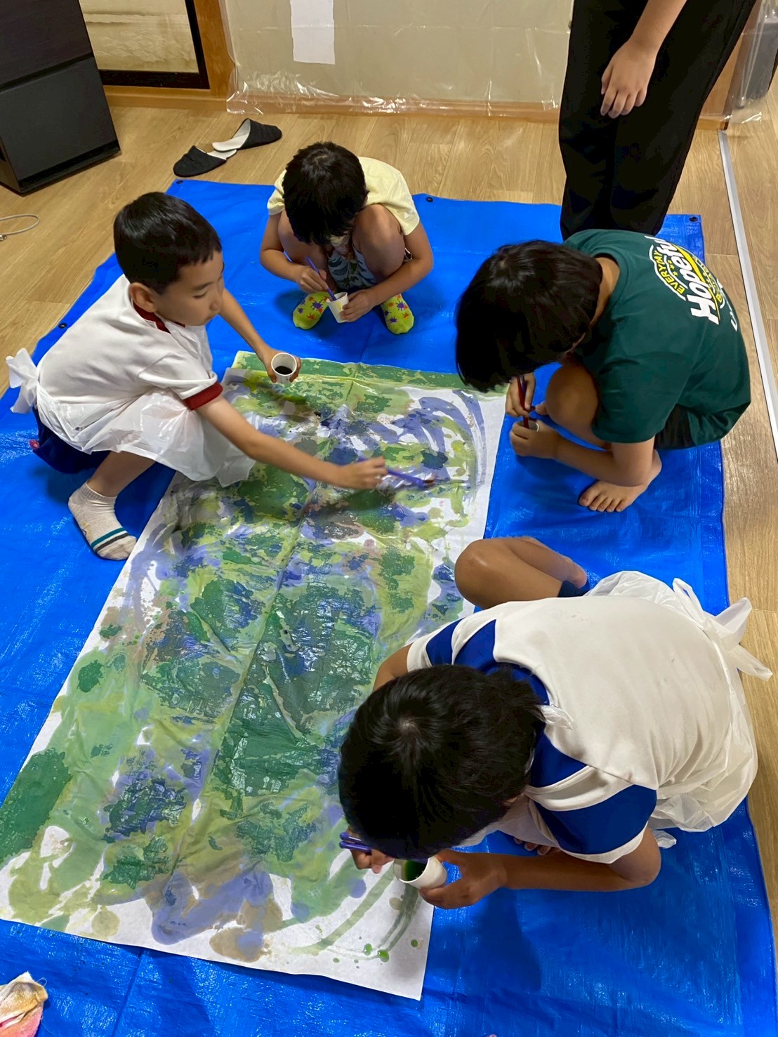 教室内では季節に合わせて壁面を秋色にしようと子供達で大きな模造紙を色付けしました。
