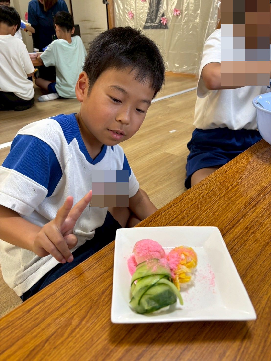 おやつ作りでは、てまり寿司といも餅を作りました。きゅうり、錦糸卵、ハムを酢飯と