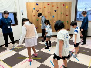 ルール遊びでも身体を動かすプログラムを行いました。音楽と職員の声掛けに合わせ、指定された色のテープを踏んでいきます!