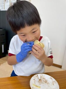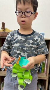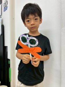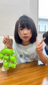 毛糸を巻き付けて「サツマイモ」を作ったり、輪つなぎで「ぶどう」を作ったり、「とんぼのめがね」等、秋をイメージした工作を行いました。