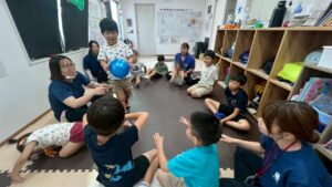 もう一つは、ボールを「足で右隣の人に渡す」や「手で左隣の人に渡す」「黒い服を着ている子に渡す」「一人飛ばしで渡す」等の指示がありました。よく聞いていないと出来ないゲームでしたが、よく話を聞いて楽しむことが出来ました🥎
