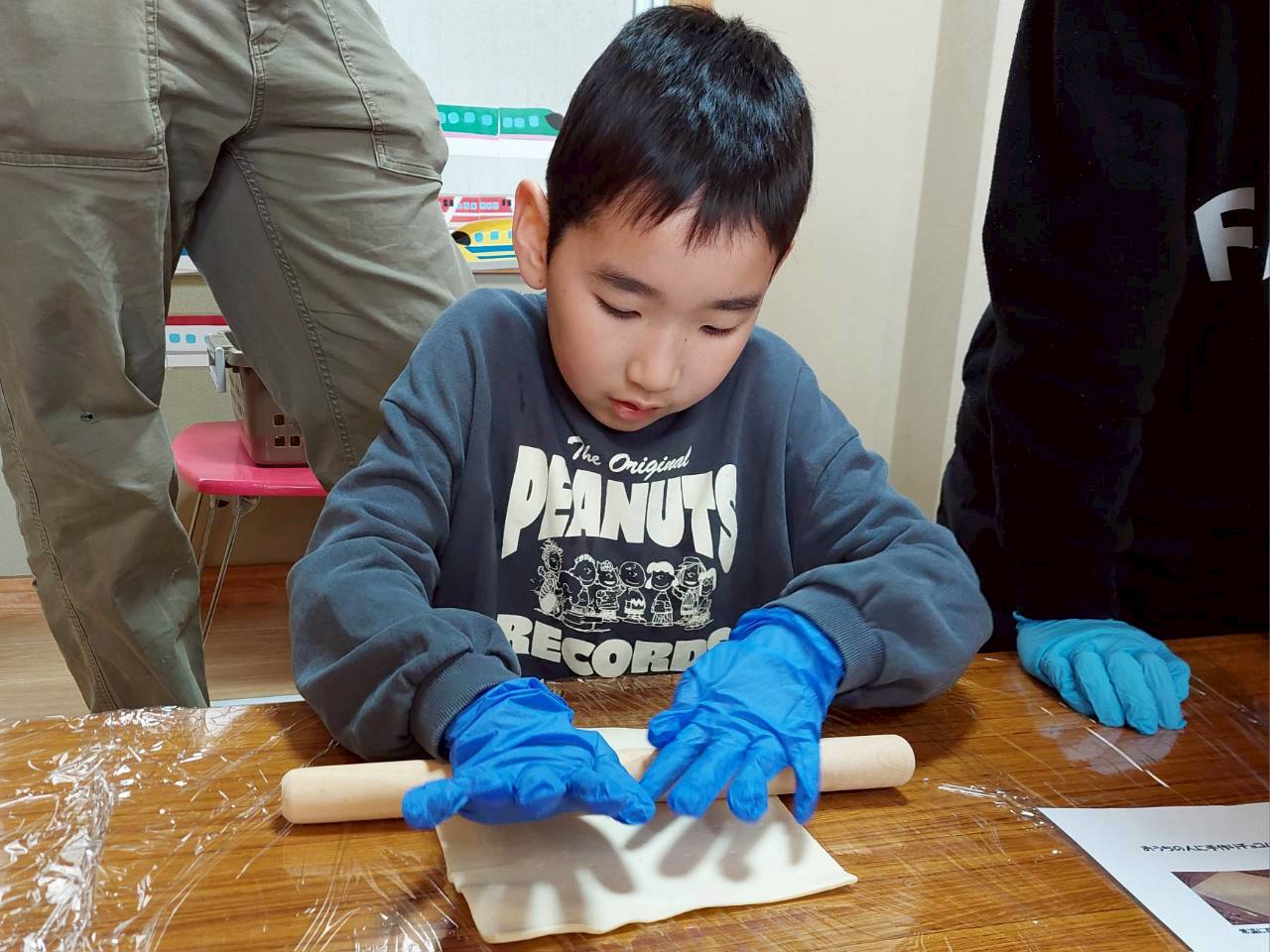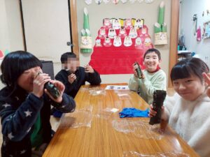 子供達はラップで具と酢飯を巻き、形を整えてから海苔をつけることで美味しそうな恵方巻が完成しました。