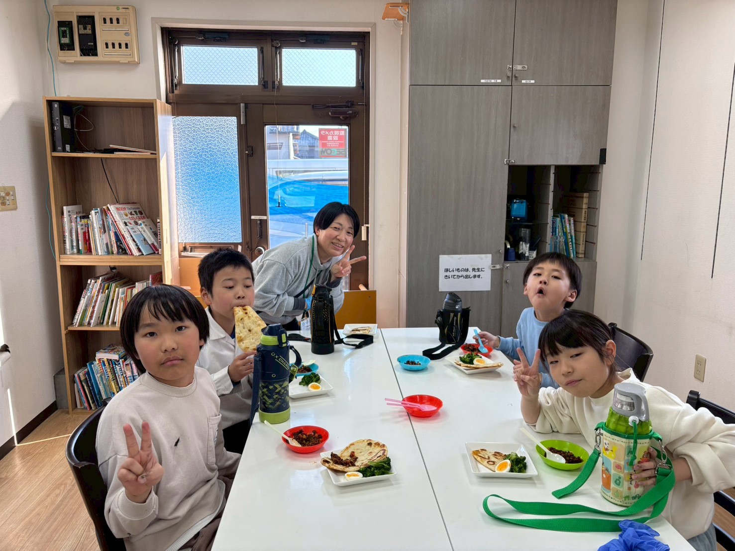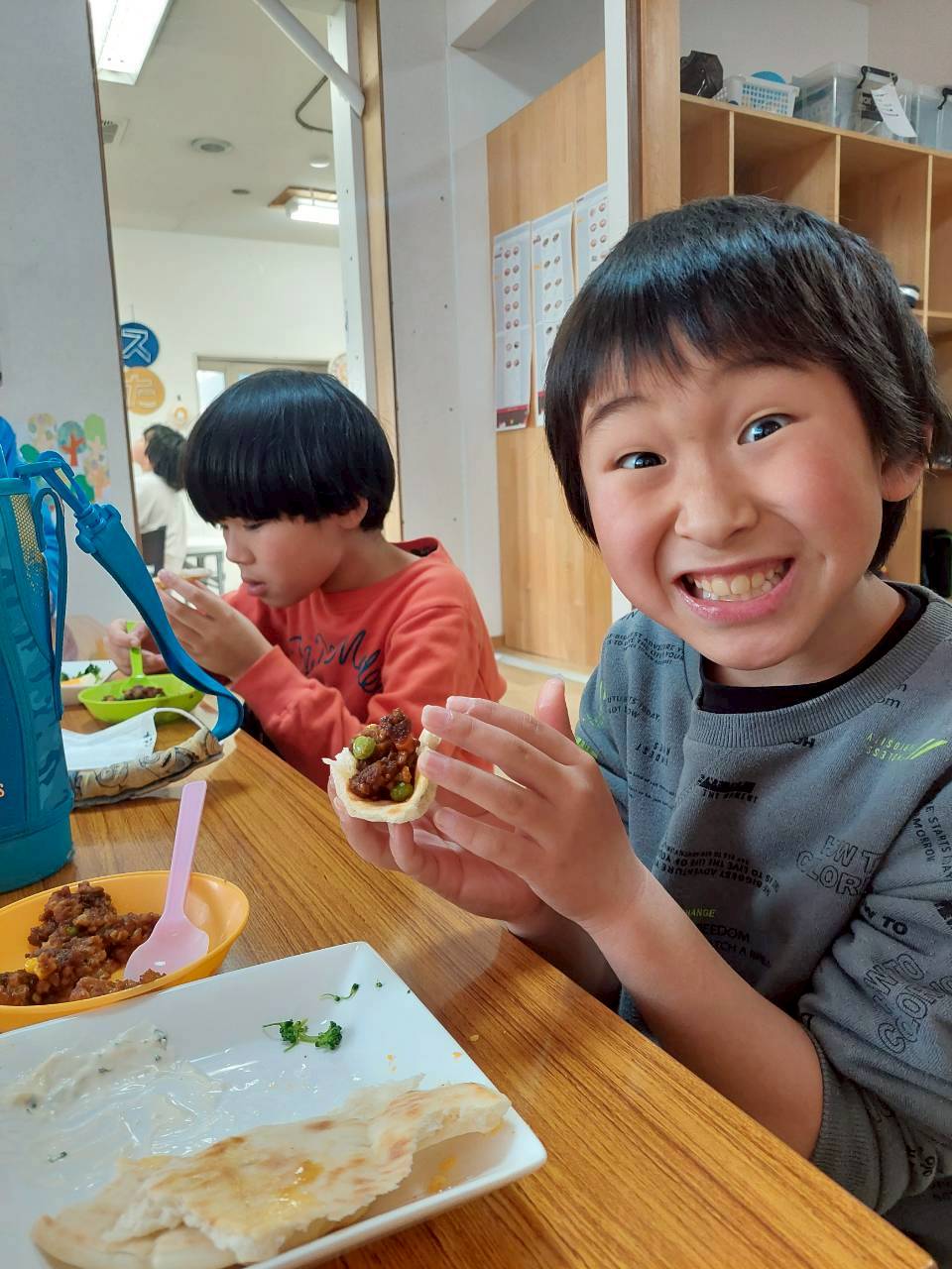今回はナンで食べてみました。ナンを知らない子供もいて職員が食べ方を教えると「こんな美味しい食べ物があるんだ」と新しい食の発見が出来ました。