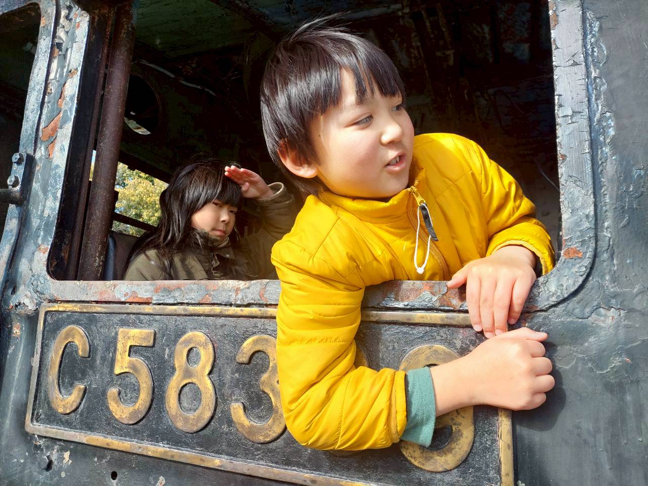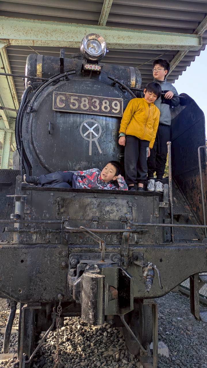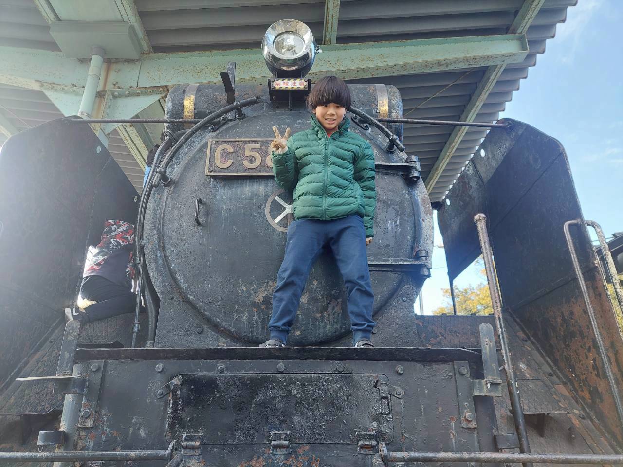 駅のすぐ近くに蒸気機関車が置いてあり、子供達はそれに乗って大喜び。汽車の上は高さもありましたが、