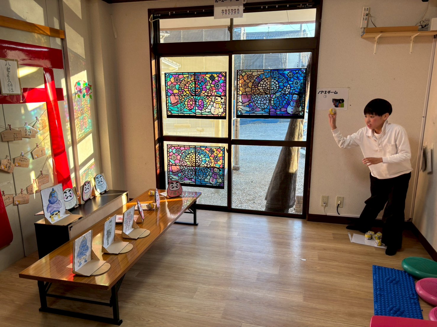 豆まきでは鬼に見立てた的にお手玉を豆に見立てて投げました。